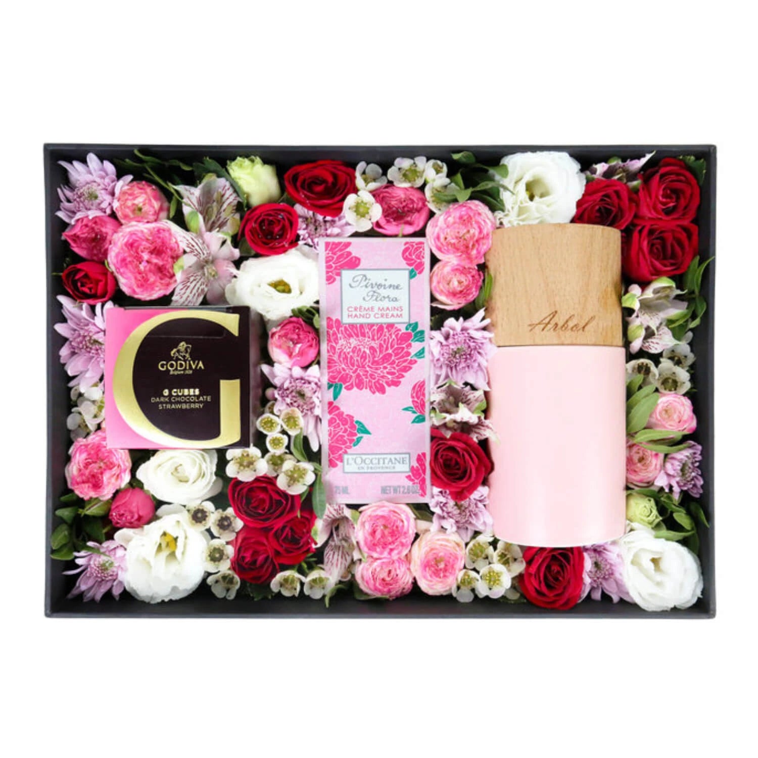 Delight someone special with this elegant rose arrangement gift box, designed to convey thoughtfulness and style. Featuring a beautiful selection of pink little roses, this arrangement brings charm and freshness to any space. Accompanying the floral display is a Francfranc Arbol Room Fragrance Diffuser in pink, infusing the room with a soothing and pleasant aroma. To pamper the senses, a L’Occitane en Provence Hand Cream in a random flavor is included, providing luxurious care for the hands. Sweeten the moment with a Godiva G Cube Truffle, offering a rich and indulgent treat. All items are beautifully presented in a Give Gift Boutique gift box with a sleek black base and transparent cover, creating an impressive and stylish presentation. This carefully curated gift box is perfect for birthdays, anniversaries, or simply to express love and appreciation.