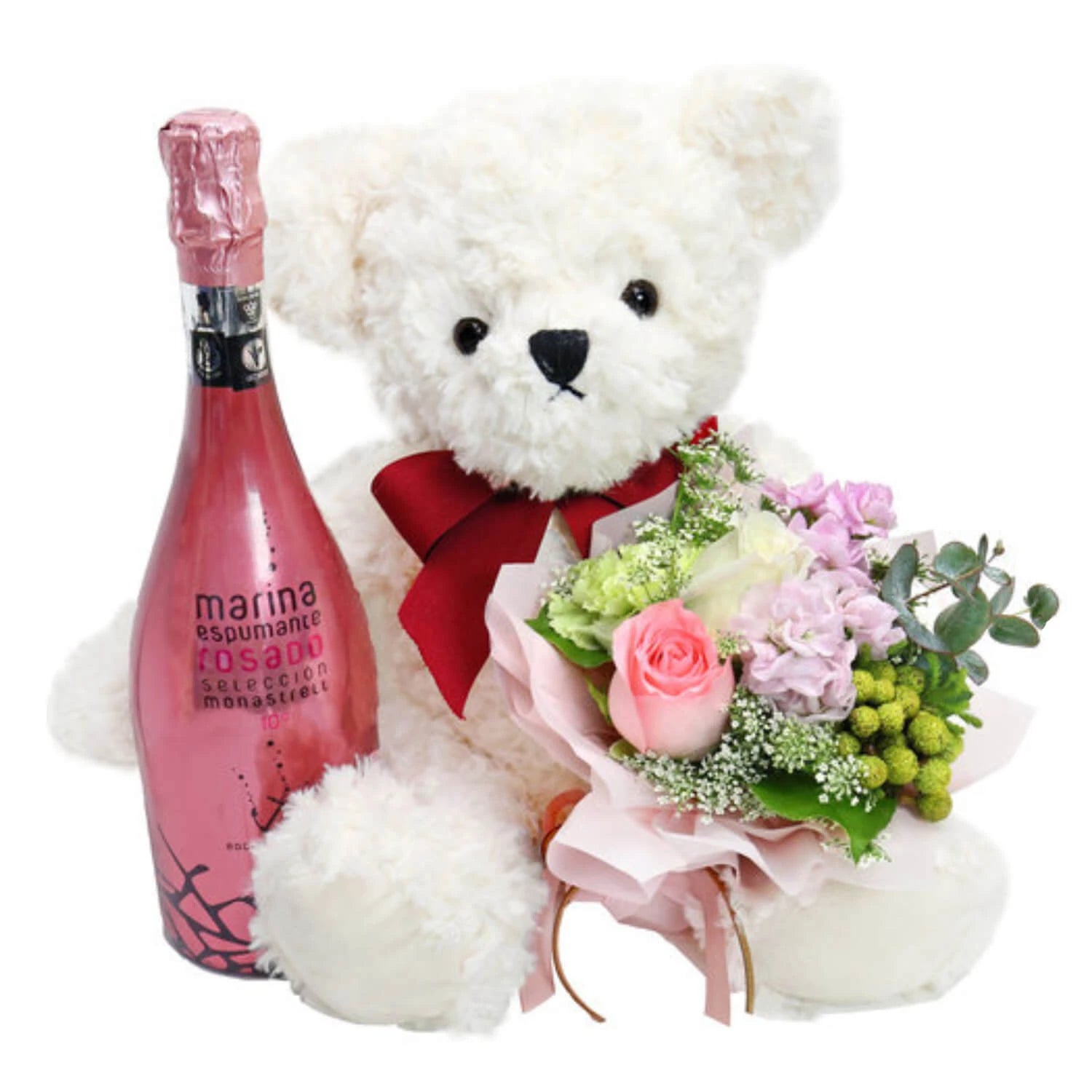 Celebrate special moments with this charming gift set, thoughtfully curated to bring joy and warmth. The centerpiece is a bottle of BOTTEGA Moscato Dolce, offering a delicate, sweet aroma and a touch of elegance for any celebration. Complementing the sparkling wine is a classic white teddy bear, soft and cuddly, perfect for conveying love, care, and comfort. Adding a fresh and fragrant touch, a mini bouquet of carefully selected flowers accompanies the set, bringing color and natural beauty to brighten the recipient’s day. Each item is beautifully arranged to create a memorable and stylish presentation, ideal for birthdays, anniversaries, or simply to express affection. This gift set combines taste, charm, and sentiment, ensuring a thoughtful gesture that will be cherished.