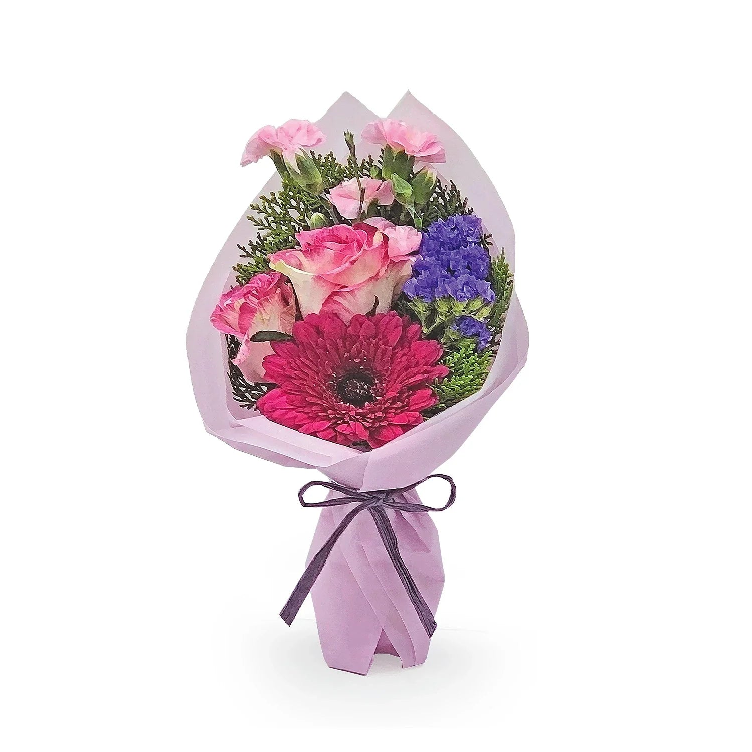 A charming petite hand bouquet of Pink Roses and Pink Gerberas, beautifully complemented with Pink Carnation Spray.