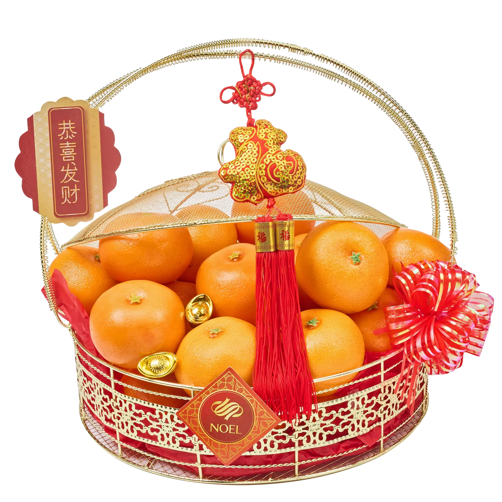 - 18pcs. Mandarin Oranges, beautifully arranged in a gold round wire basket with cover, decorated with festive CNY accents