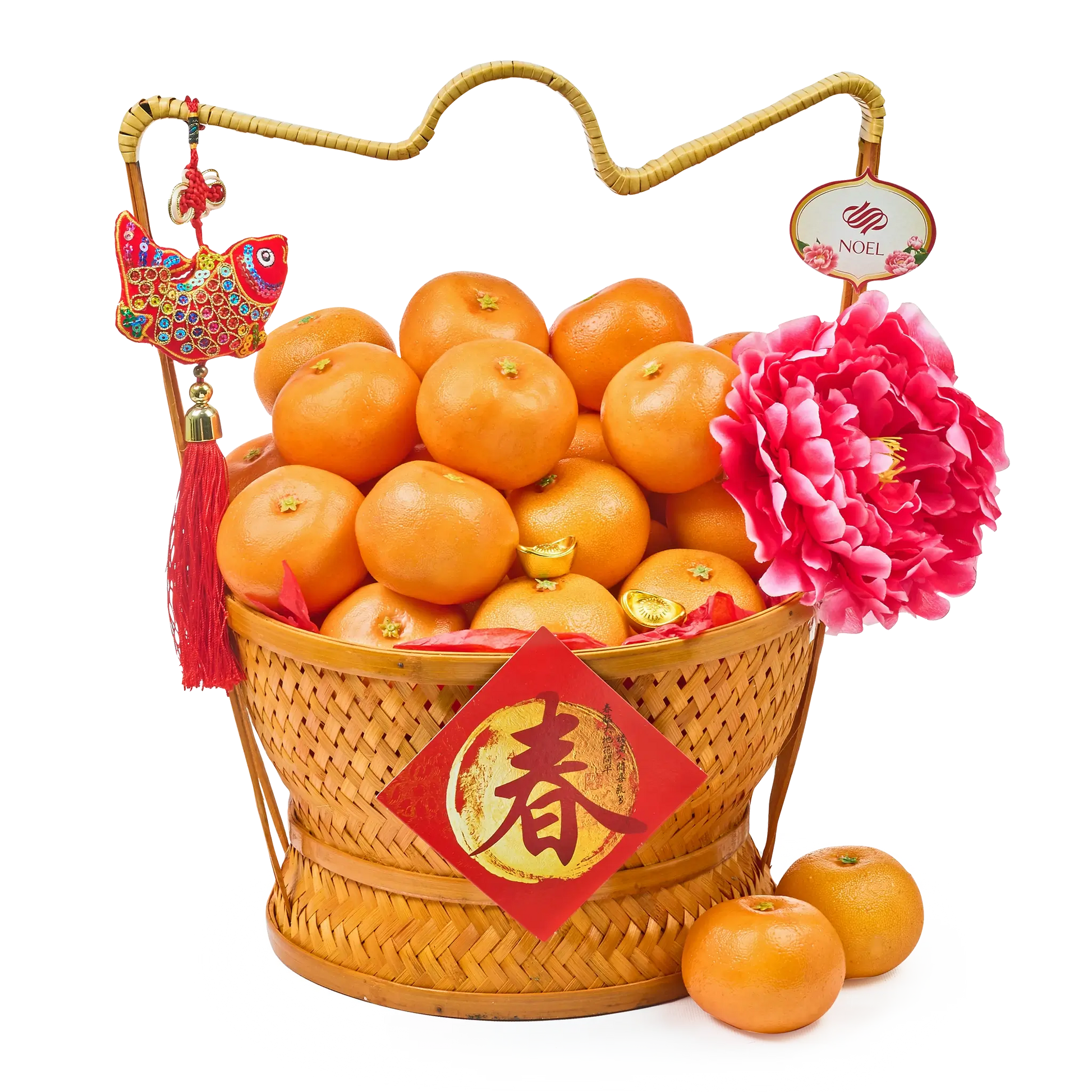 - 28 Mandarin Oranges, beautifully arranged in an orange round basket with handle (33x20cm), decorated with artificial Peony and festive CNY accents