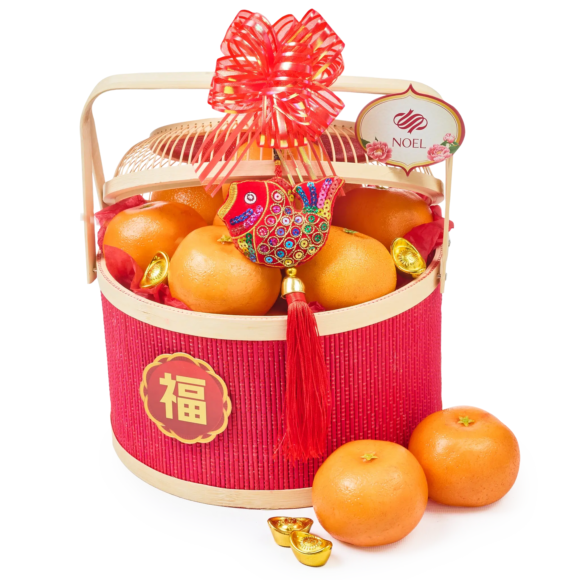 - 18 Mandarin Oranges, arranged in a red round bamboo basket with handle (26x19cm), decorated with festive CNY accents