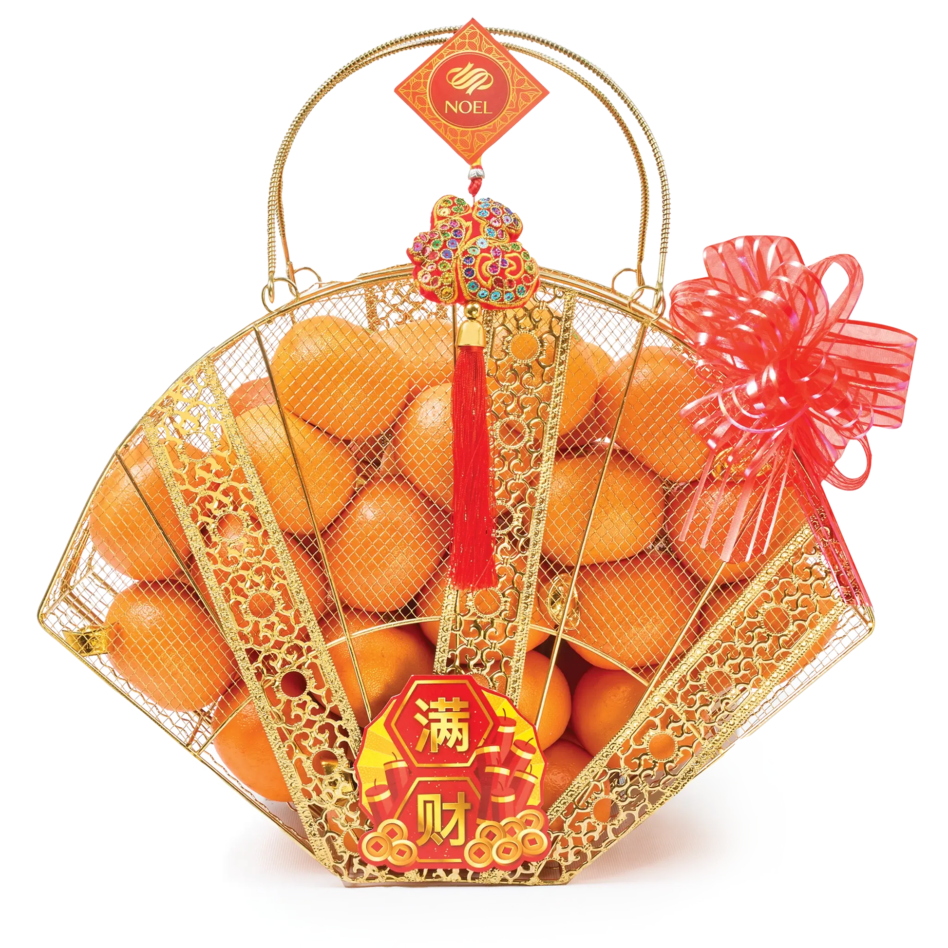 - 28 Mandarin Oranges, beautifully arranged in a fan-shaped gold wire basket (45x16x14cm), decorated with festive CNY accents