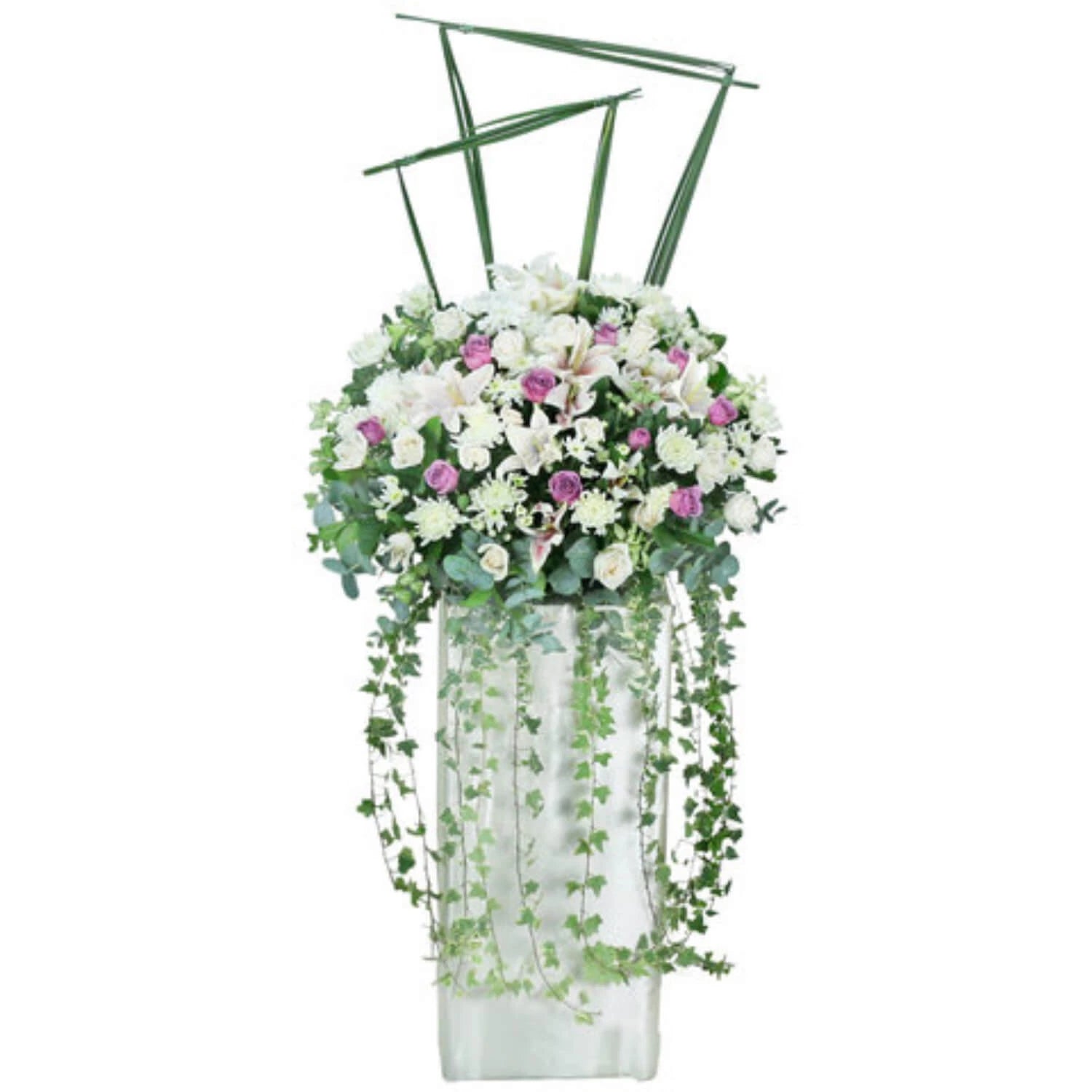Express your heartfelt sympathy with this elegantly arranged funeral standing bouquet, designed to convey care, respect, and remembrance. The arrangement features pristine white lilies and white chrysanthemums, symbolizing purity, peace, and condolence, complemented by delicate white and purple roses, which add a gentle touch of elegance and dignity. Lush matching greenery enhances the natural beauty of the bouquet while creating a harmonious balance of colors and textures. Standing at approximately W 65–85 cm x H 150–180 cm, this arrangement is perfect for memorial services, funerals, or sending condolences to those mourning a loss. Each flower is carefully selected and thoughtfully arranged to create a meaningful and lasting tribute. Actual colour tones of flowers may differ slightly from the image.