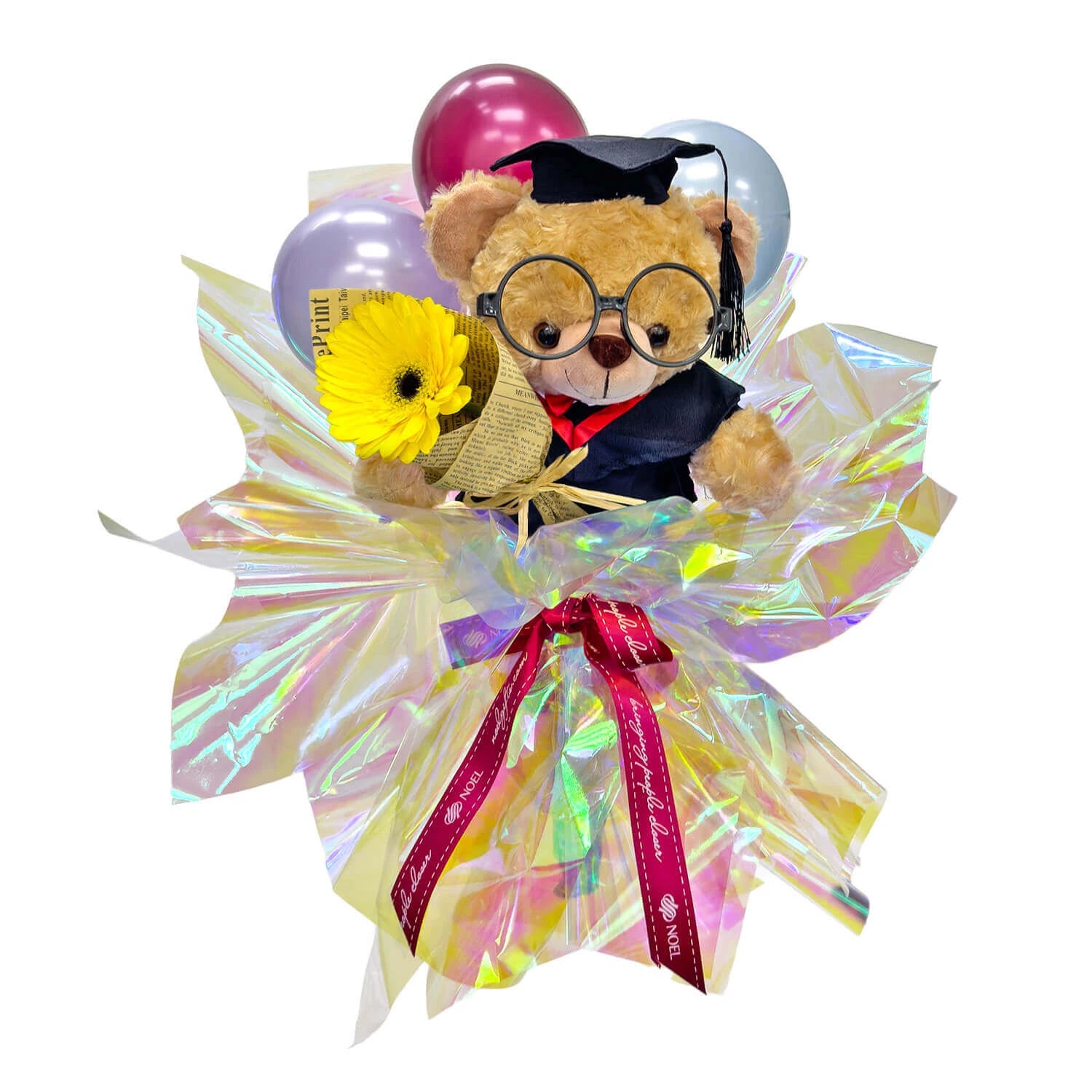 Celebrate graduation with a 25cm bear, 3 vibrant balloons, and a cheerful Gerbera floral accent.