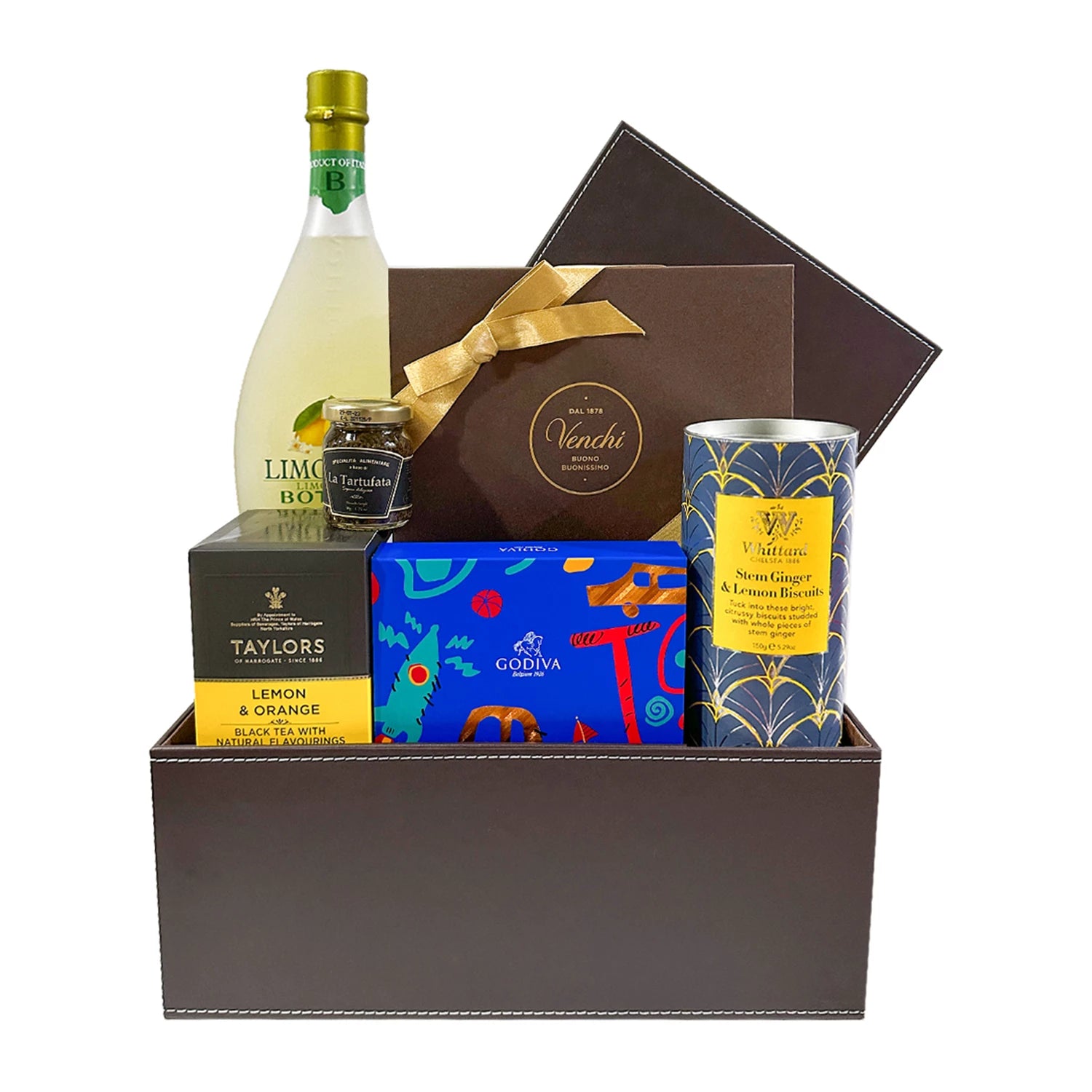 Elevate any celebration with this exquisite curated gift hamper, thoughtfully designed for those who appreciate fine flavours and luxurious details. Featuring Bottega Lemon Liqueur from Italy, this set brings a refreshing zest and elegant touch to the collection. It also includes an indulgent Italian Venchi Chocolate Gift Box, known for its premium craftsmanship, and buttery Whittard biscuits imported from the UK for a delightful crunch. A charming Godiva Kids Chocolate Gift Box adds a playful sweetness, perfectly complemented by Taylors English black tea bags for a refined, aromatic brew. The hamper also features authentic Italian black truffle sauce made with black truffle and mushrooms—an exceptional gourmet treat. To complete the gift, all items are presented in an eco-friendly artificial leather box with a lid, offering both style and sustainability. Preserved flowers accompany the hamper and can last for a year or more with proper care.