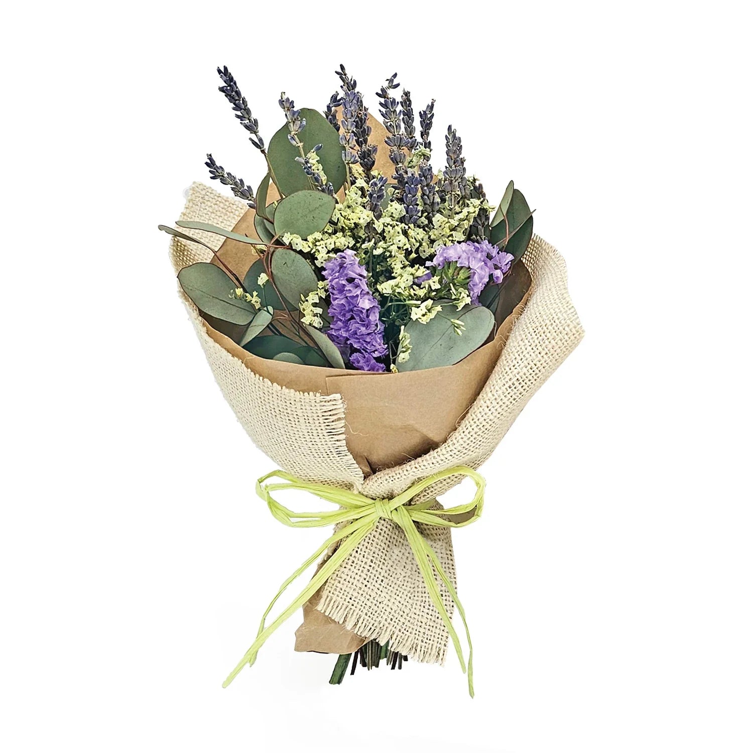 - This petite hand bouquet consists of purple Caspia, White Caspia, accompanied by Red Hypericum, Round Eucalyptus and Dried Wheat Grass.