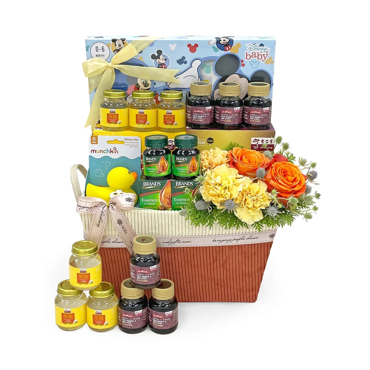 This Newborn Baby Gift consists of Eu Yan Sang Bird's Nest with Rock Sugar 6x70g Eu Yan Sang Essence of Chicken with Wolfberries & Red Dates 6x70g Brand's Essence of Chicken with Cordyceps 2x68ml Disney Mickey Gift Set Munchkin Safety Bath Ducky Floral Arrangement Actual colour tones of flowers may differ slightly from image.NOEL reserves the right to replace any item with another of equivalent value depending on availability without prior notice.