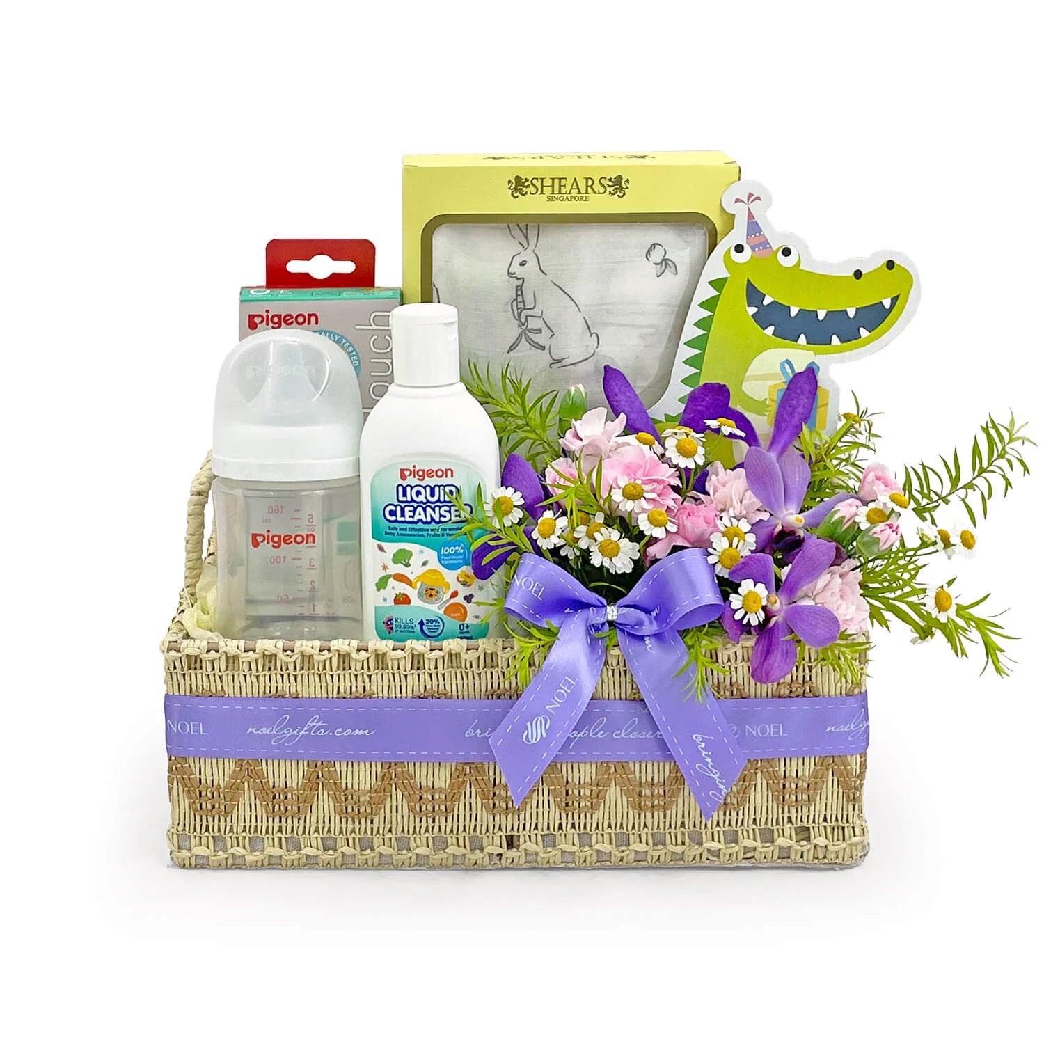 This Newborn Baby Gift consists of Pigeon SofTouch 3 Nursing Bottle 160ml Shears Muslin Swaddle Pigeon Liquid Cleanser 200ml Floral Arrangement Actual colour tones of flowers may differ slightly from image.NOEL reserves the right to replace any item with another of equivalent value depending on availability without prior notice.