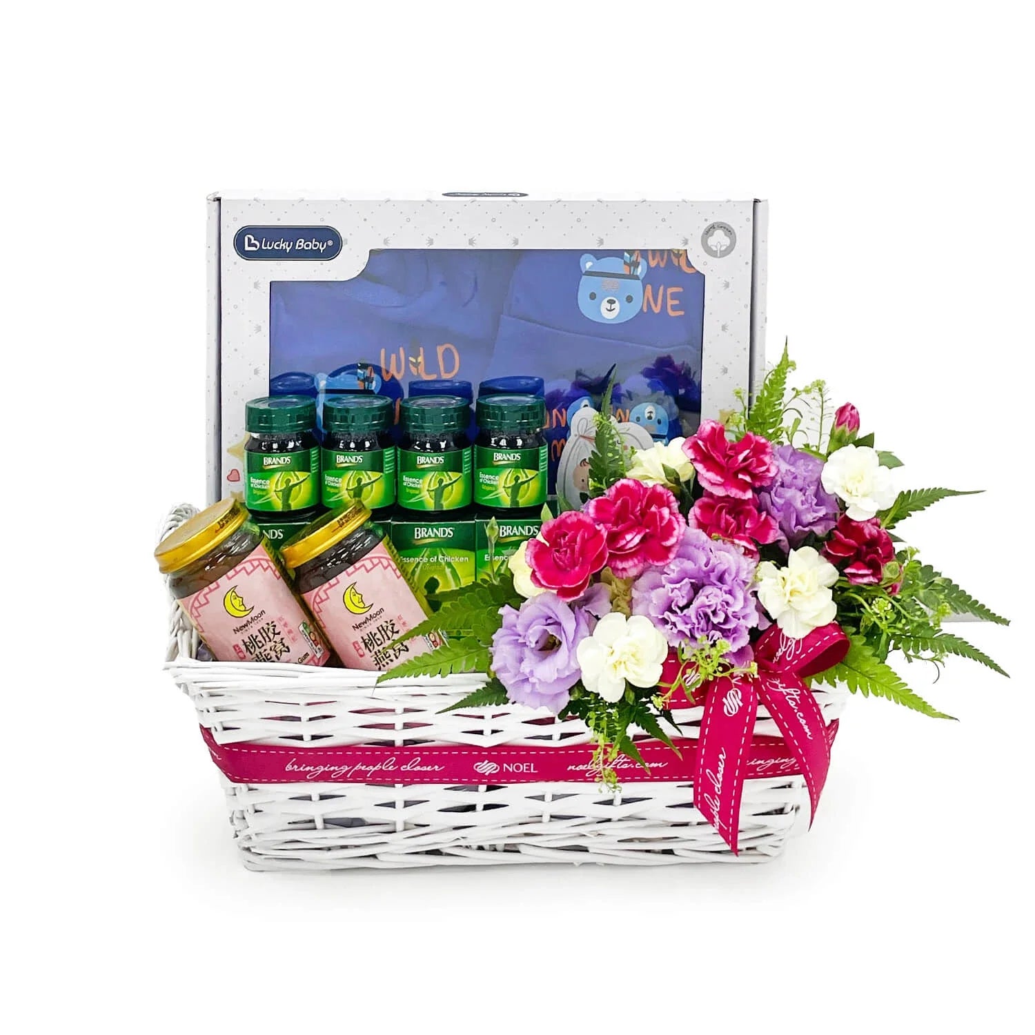 This Newborn Baby Gift consists of New Moon Bird's Nest Peach Gum with Red Dates & Wolfberries 2x150ml Brand's Essence of Chicken 4x41ml Lucky Baby 4pcs Clothes Gift Set Floral Arrangement Actual colour tones of flowers may differ slightly from image.NOEL reserves the right to replace any item with another of equivalent value depending on availability without prior notice.