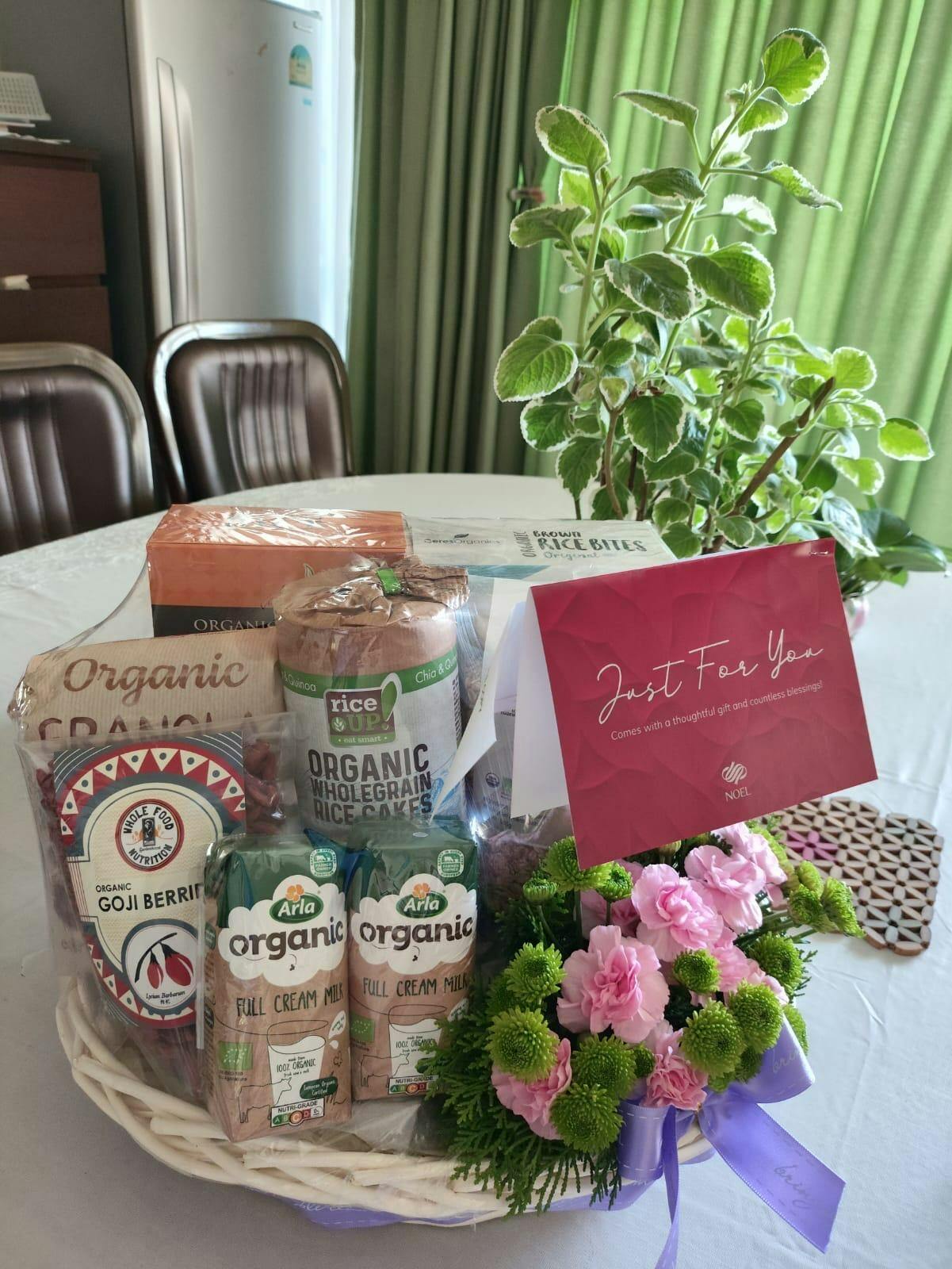 This arrangement consists of: Familia Organic Granola Chocolate Amaranth 375g Nature's Superfoods Organic Regular Rolled Oats 500g Arla Organic UHT Milk 2x200ml Ceres Organic Rice Bites Original 100g Riceup! Organic Brown Rice Cakes Chia & Quinoa 120g Gardenscent Organic Goji Berries 350g Yes Natural Organic Brown Rice Ring Cheese 40g Floral Arrangement. NOEL reserves the right to replace any item with another of equivalent value depending on availability without prior notice.