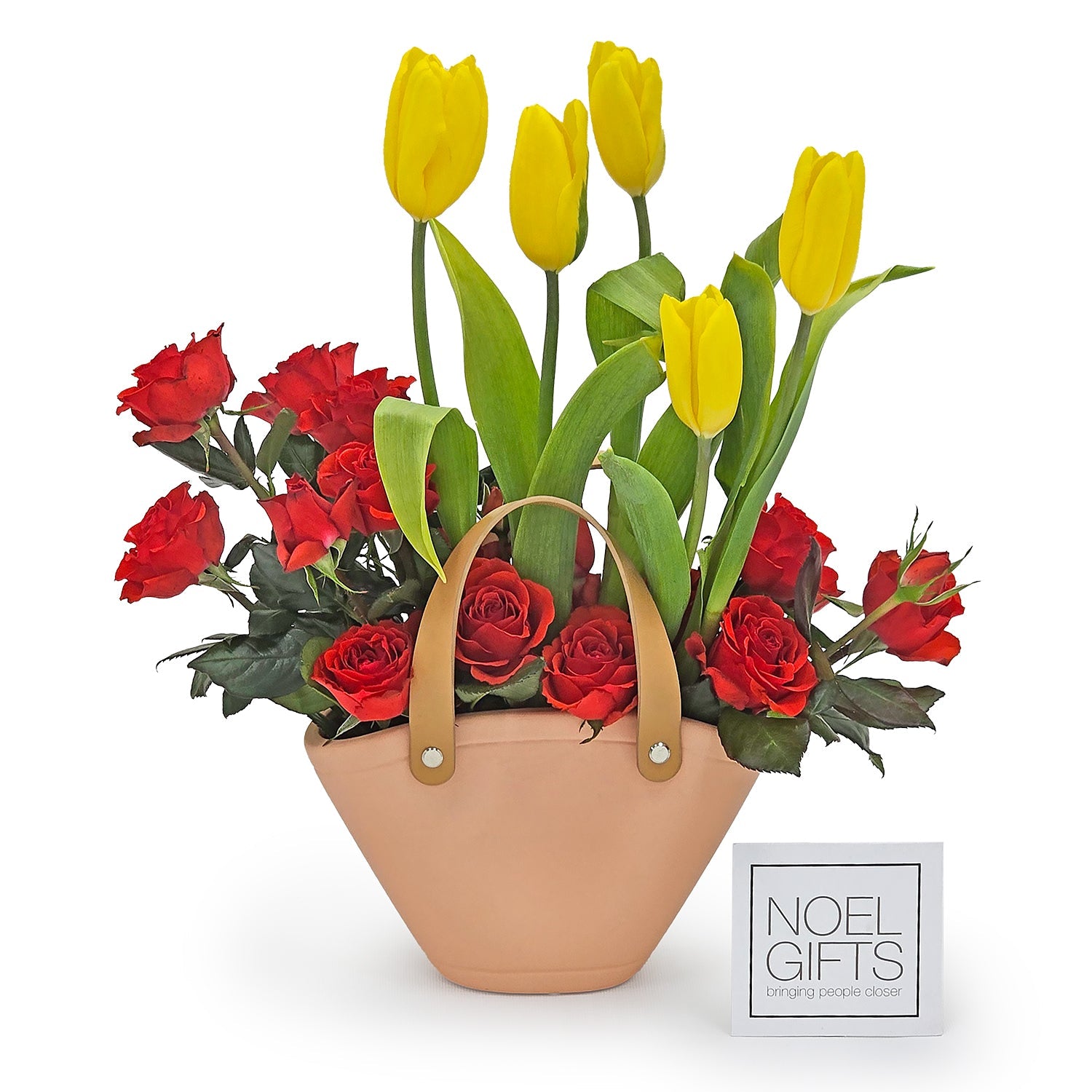 Sunny yellow tulips paired with vibrant red rose sprays, beautifully presented in a light pink handbag vase.