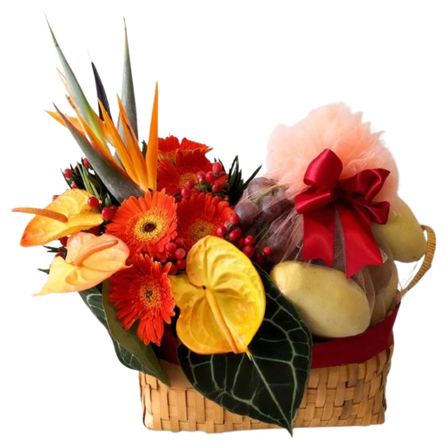 • 3 Bird Of Paradise, 3 Orange Anthurium, 5 Orange Gerberas with Assorted Fruits