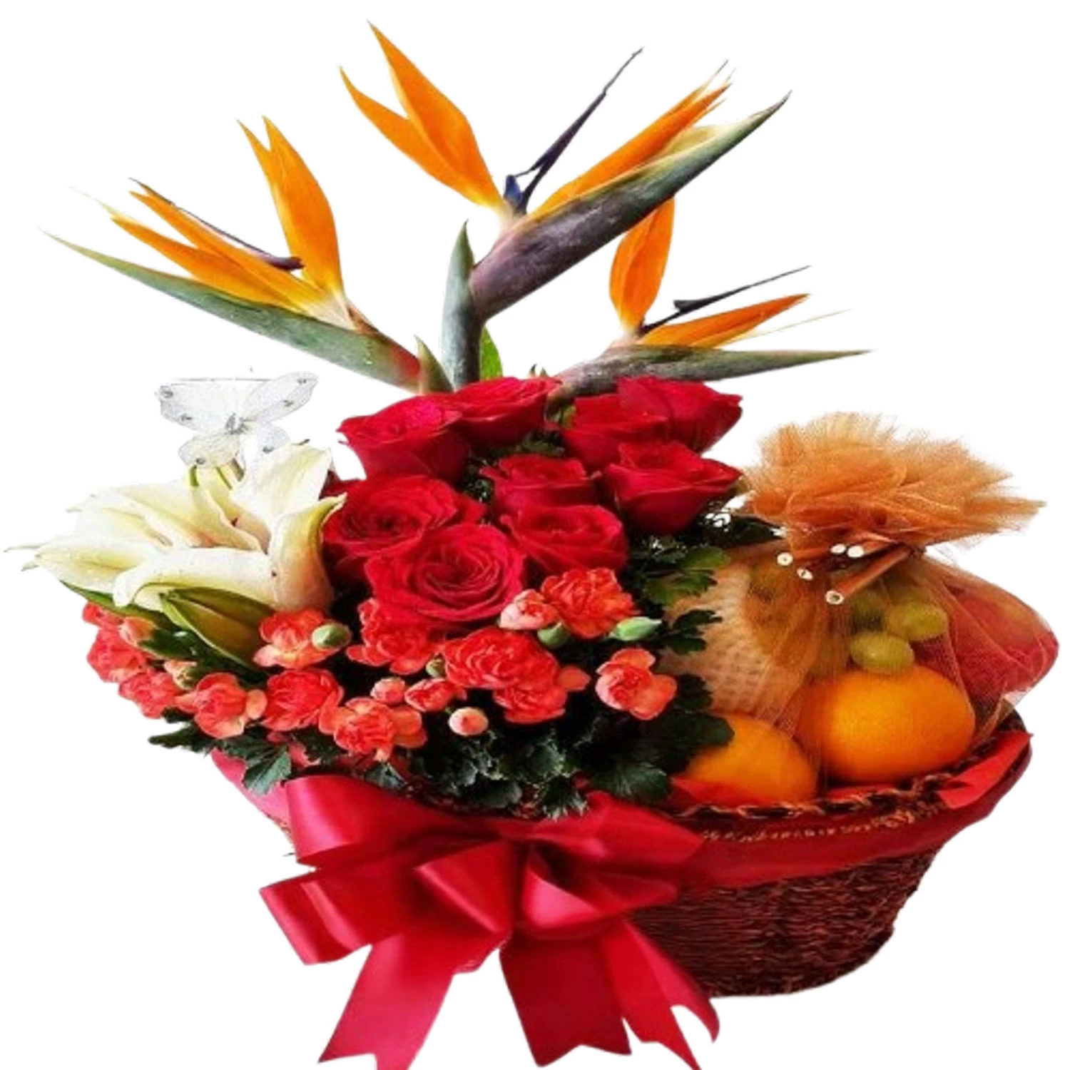 • 3 Bird Of Paradise, 8 Red Roses, 3 Lilies, Spray Carnations with Assorted Fruits