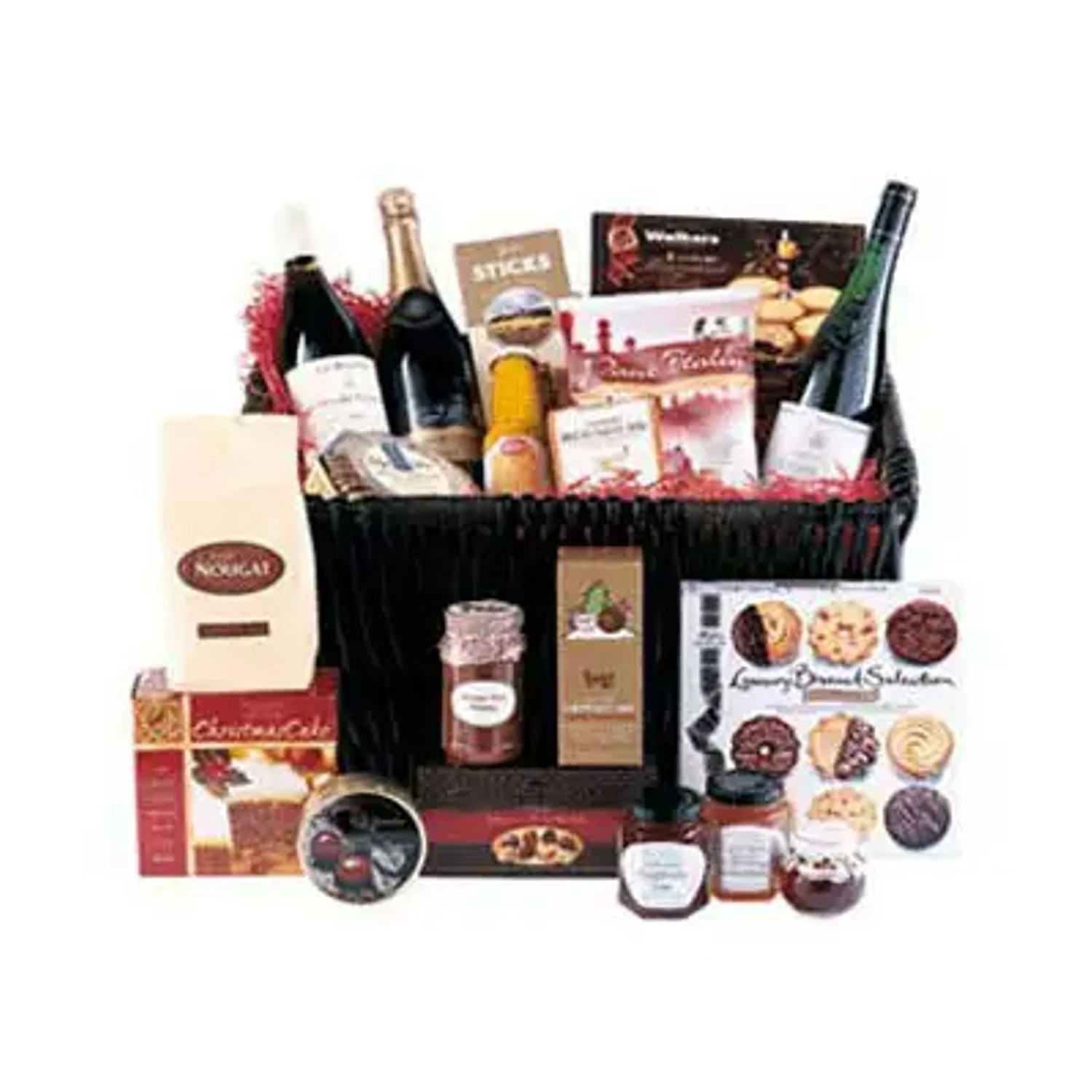 Champagne, 2 bottles of wine with assorted chocolates and titbits in a basket