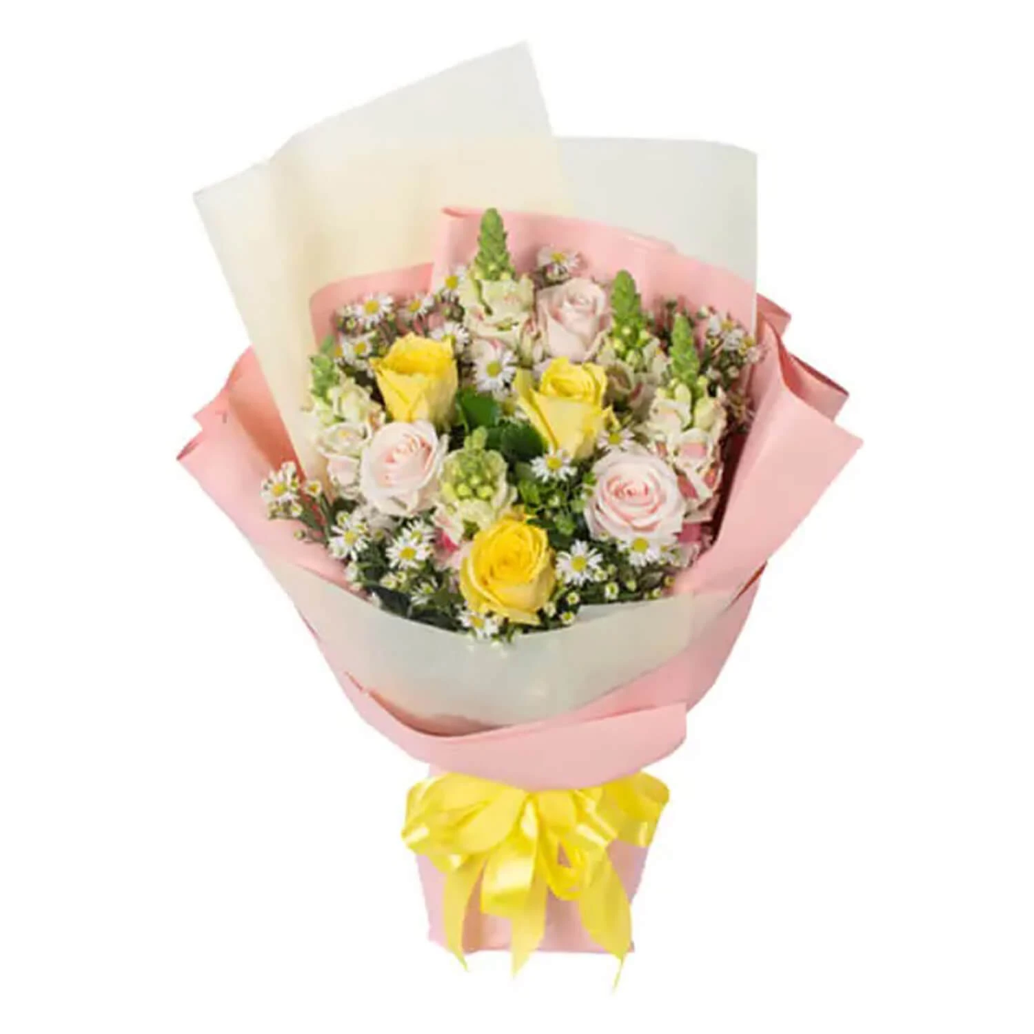• An alluring Hand Bouquet with Soft Pink Roses and Yellow Roses.