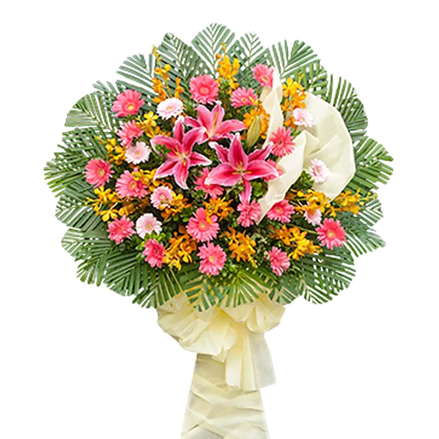 • This Bright Grand Opening Stand consists of 3 Lilies in the middle, Pink Gerberas, and other yellow fillers