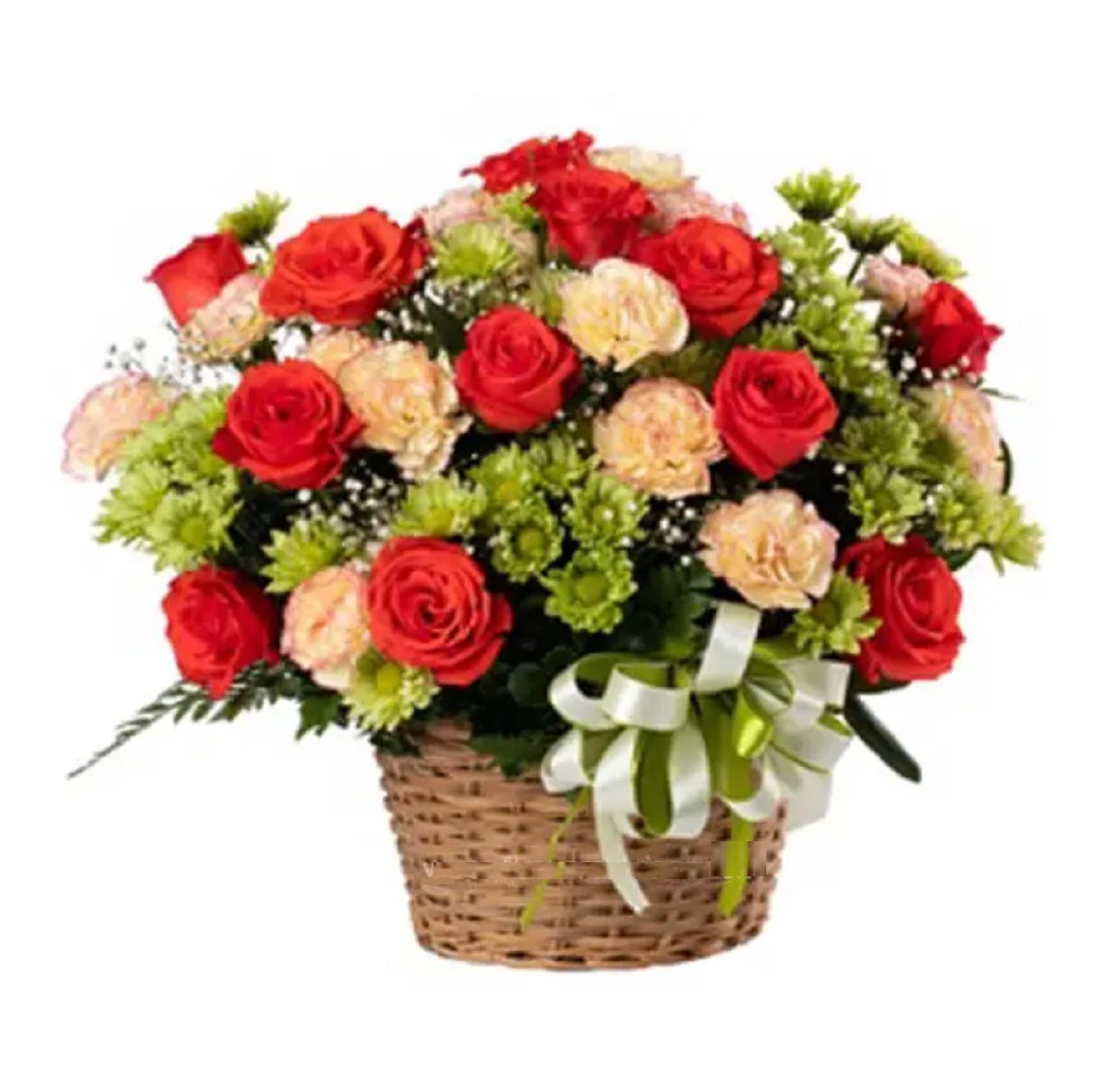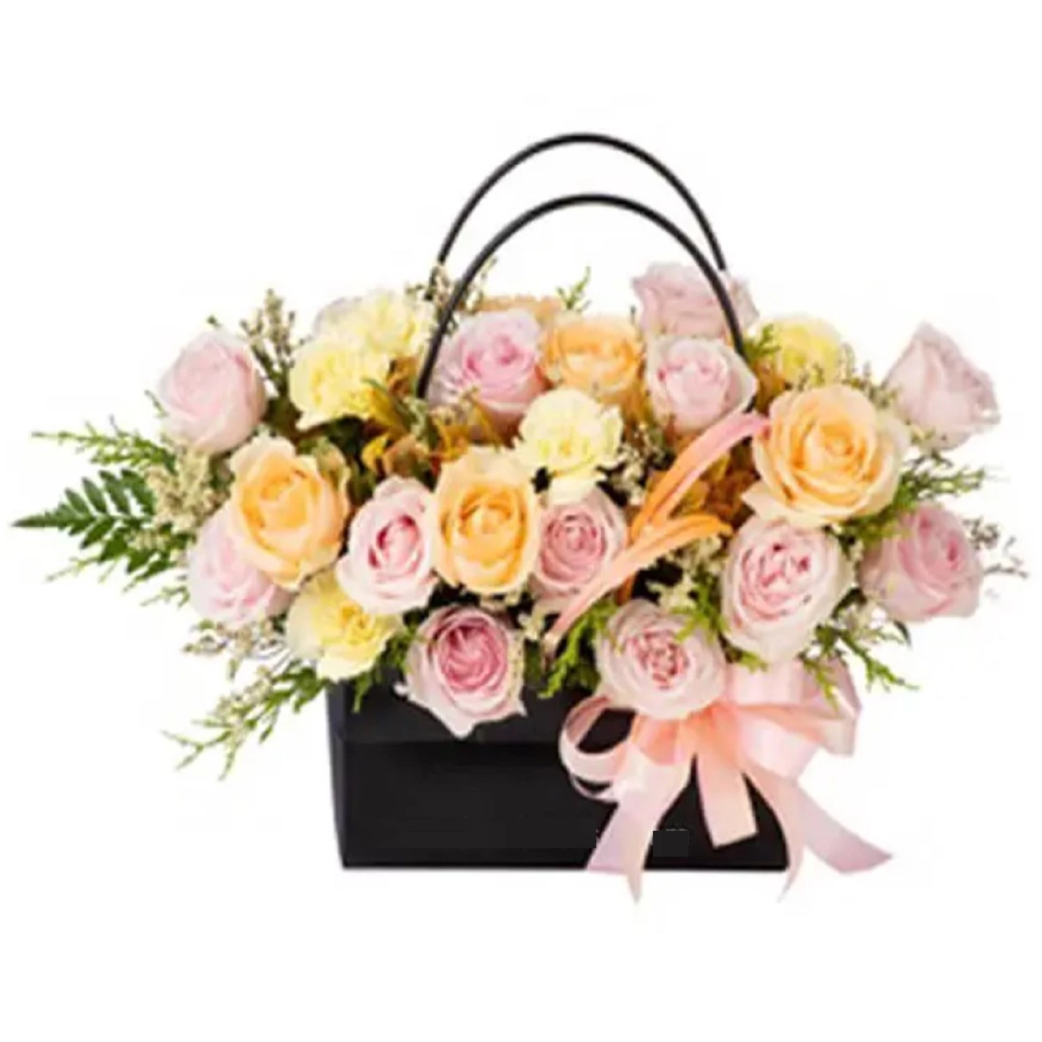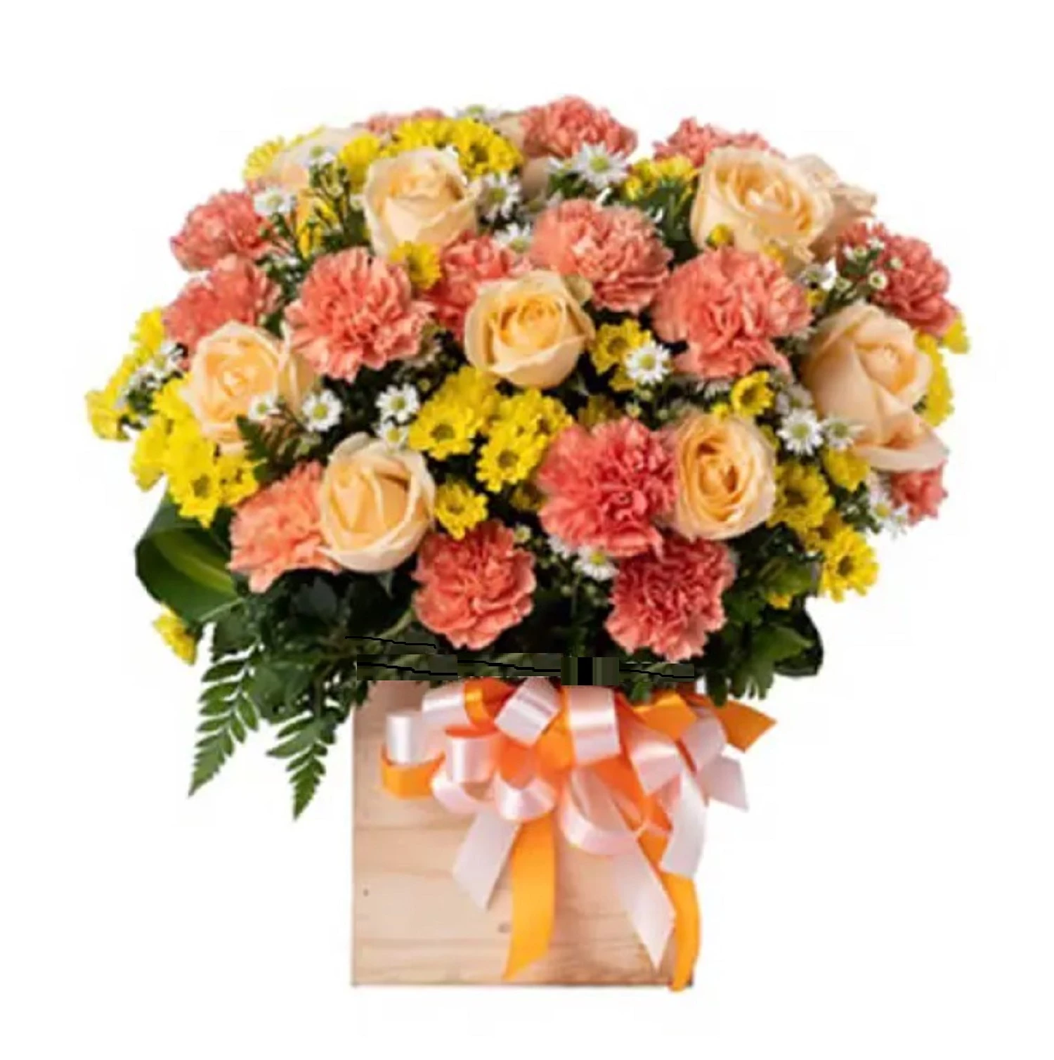 • A mix of peach carnations and champagne roses arranged beautifully in a square vase.
