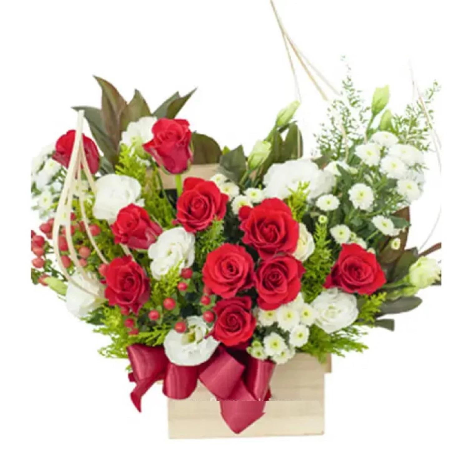 • An arrangement of Red Roses, White Roses with white and green accents fillers.