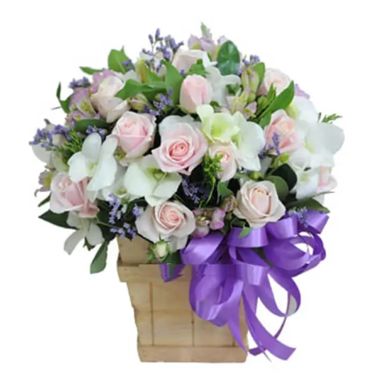 • A hand bouquet with 6 Pink Roses, 6 White Roses, and Baby breath Fillers.
